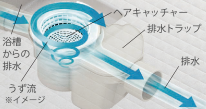 浴槽のお湯を排水する時に、排水口内にうずを発生させて毛髪やヌメリなどをキレイに洗浄します。「うず」のチカラで、排水口にたまった毛髪やゴミをまとめて捨てやすくします。