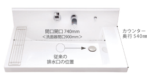 スクエアなアウトラインにやわらかなカーブを組み合わせた洗面器。洗面器の広さを最大限に生かせるよう排水口を右奥に配置しました。