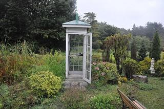 線の繋がっていない黒電話と1冊のノートが置いてある不思議な佇まいの電話ボックスがあり、
